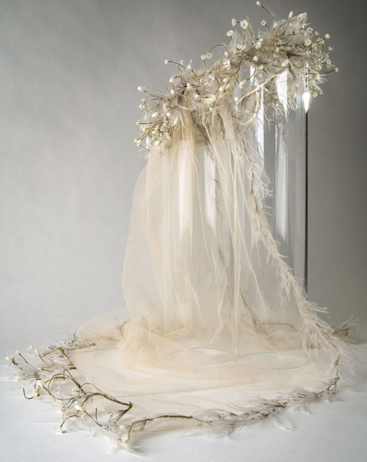 The Veil is attached to a coronet of wax buds and flowers and is trimmed with feathers and buds.